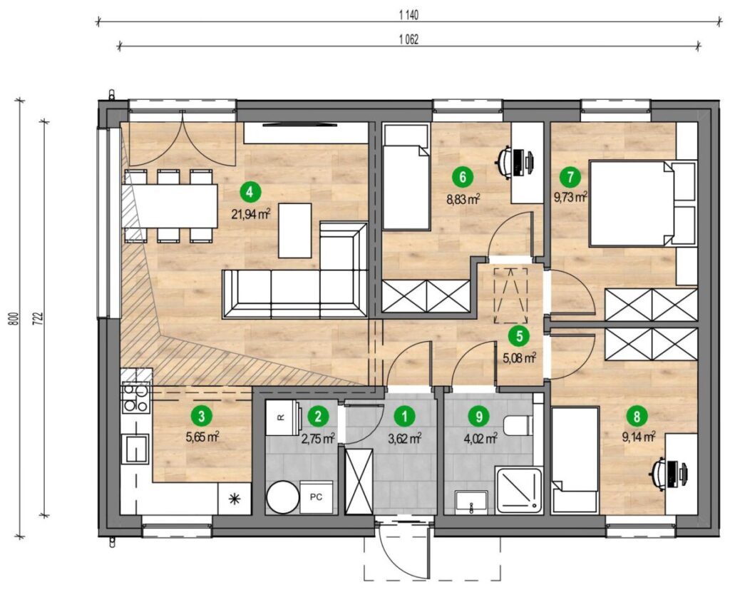 Projekt domu jednorodzinnego, który łączy funkcjonalność z nowoczesnym designem. Jego główną zaletą jest sufit katedralny w salonie, który tworzy wyjątkowe poczucie przestrzeni i nadaje wnętrzu elegancji. Przeszklona fasada zapewnia maksymalny dostęp światła dziennego, jednocześnie umożliwiając piękny widok na ogród. Zadaszony taras to doskonałe miejsce na relaks, bez względu na pogodę. Dom zaprojektowano z myślą o rodzinach, które cenią komfort, estetykę oraz energooszczędność. Kompaktowa forma budynku pozwala na optymalne zagospodarowanie przestrzeni działki, pozostawiając jednocześnie miejsce na ogród lub strefę rekreacyjną. Starannie dobrane materiały elewacyjne, takie jak drewniane detale i minimalistyczne wykończenia, nadają budynkowi nowoczesny charakter.