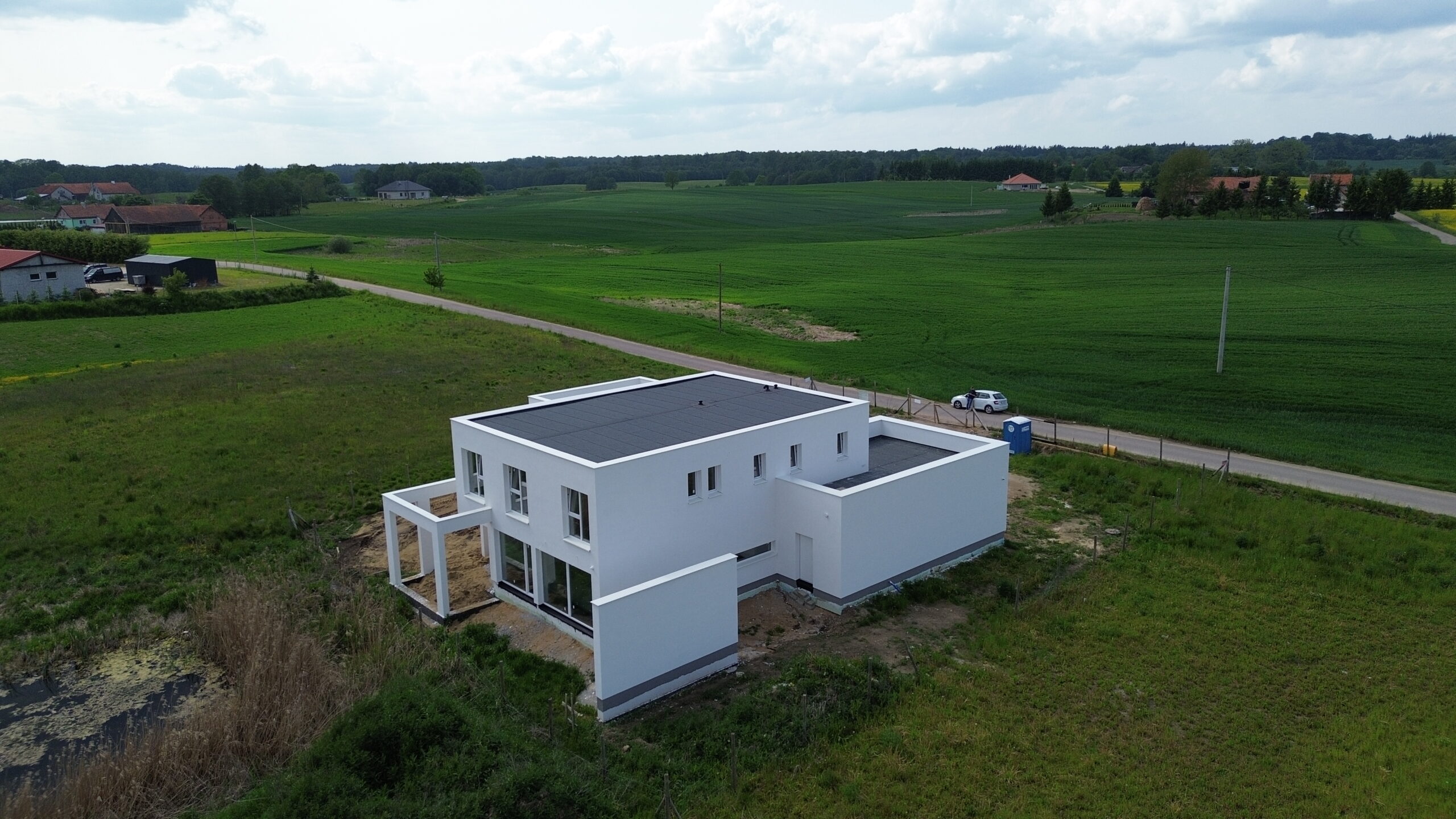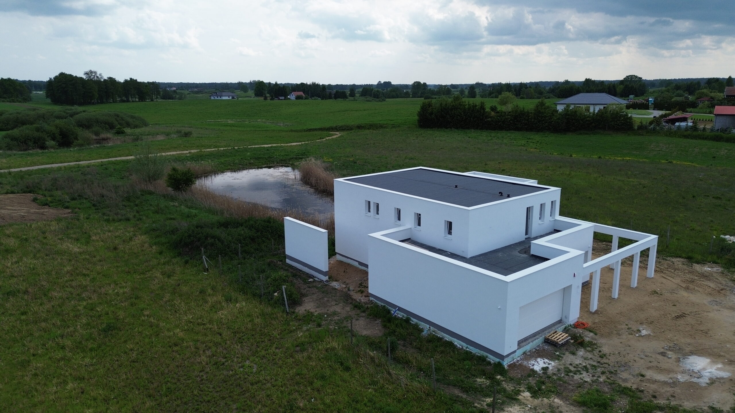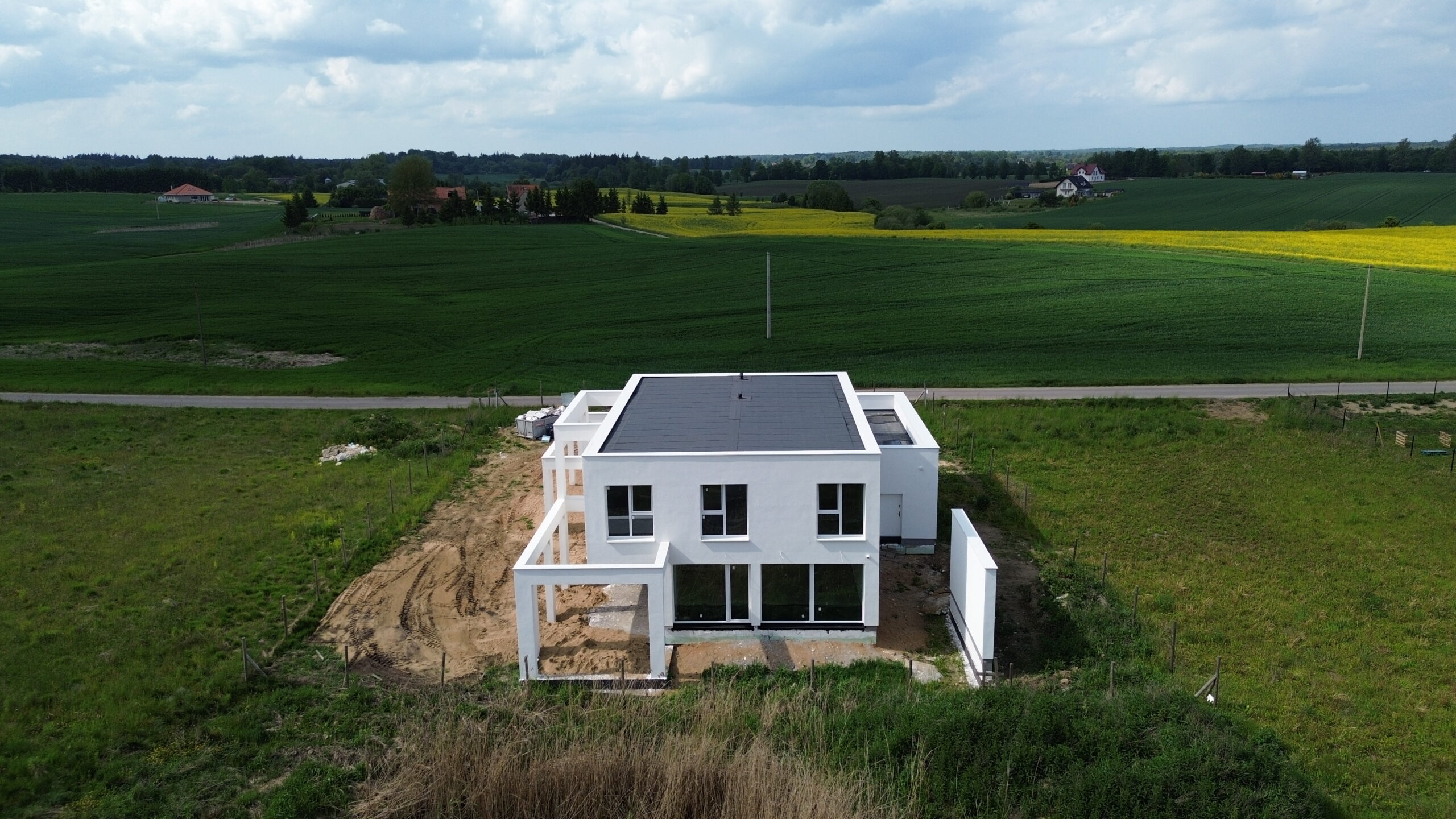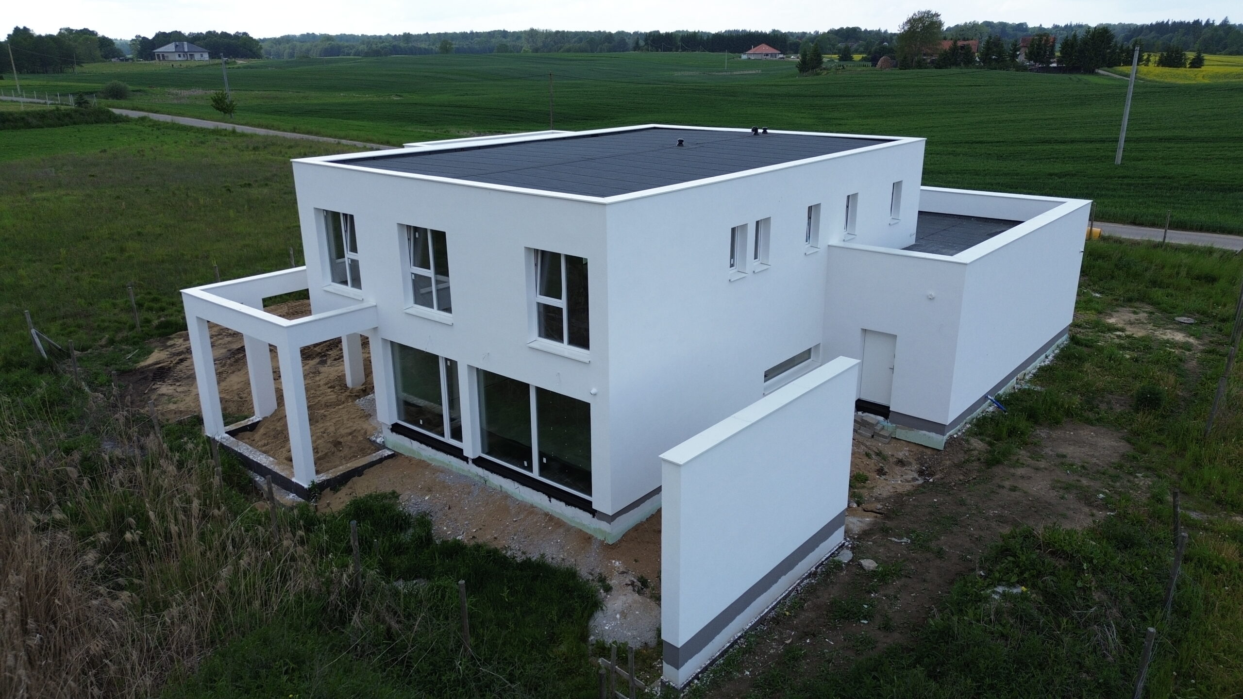 Jędrychówko to wieś w Polsce położona w województwie warmińsko-mazurskim, w powiecie ostródzkim. Tu właśnie usytuowany został dom o powierzchni użytkowej 258 m2 wzniesiony na zbrojonej płycie fundamentowej. Ściany nośne oraz działowe wykonane zostały z betonu komórkowego o odpowiedniej grubości 24cm i 12 cm. Strop gęstożebrowy typu Teriva. Więźba budynku powstała przy użyciu wiązarów prefabrykowanych, a dach budynku został pokryty dachówką betonową falistą w kolorze grafitowym.