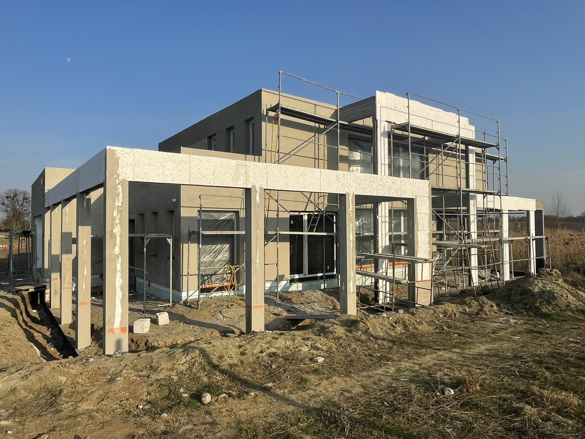 Ściany zewnętrzne zostały ocieplone styropianem grafitowym grubości 20 cm a do ocieplenia dachu użyto piany PUR o grubości 25 cm. Do wykończenia elewacji budynku użyto tynku silikonowego.