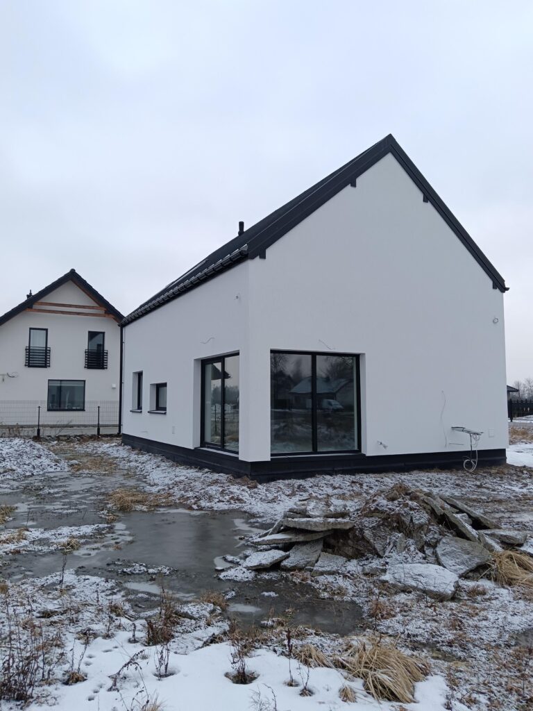 Do ocieplenie ścian zewnętrznych zastosowano styropian fasadowy o grubości 15 cm, dach ocieplono pianą PUR, a do wykończenia elewacji budynku użyto tynku silikonowego.
