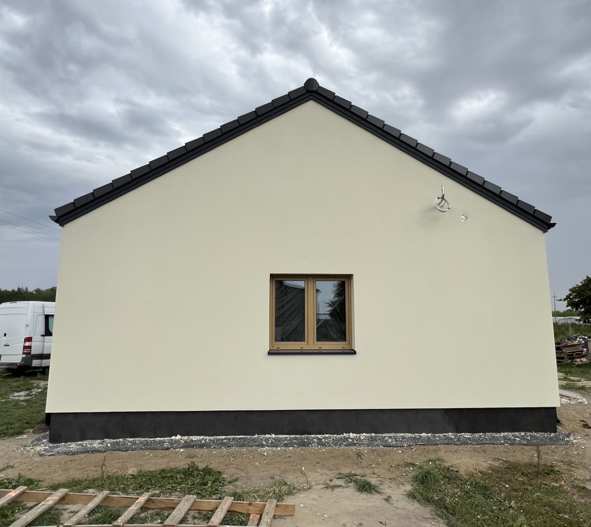 Do ocieplenie ścian zewnętrznych użyto styropianu fasadowego o grubości 20 cm. Do wykończenia elewacji budynku użyto tynku silikonowego.