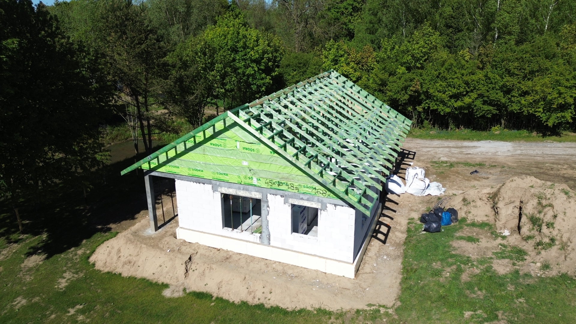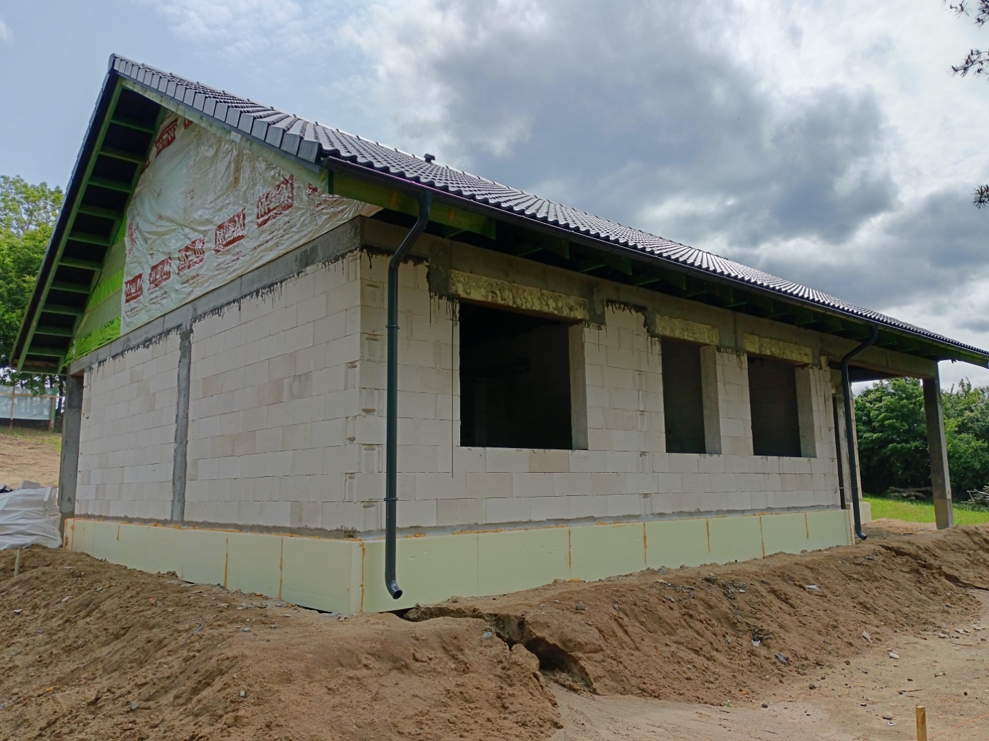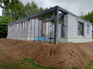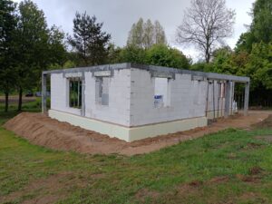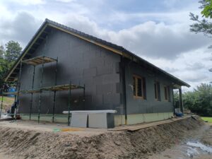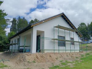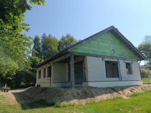 Sztofrowa Huta to wieś kaszubska w Polsce położona w województwie pomorskim, w powiecie kościerskim. Tu właśnie mieliśmy okazję wybudować cieszący się dużym zainteresowaniem dom o powierzchni 102 m2. Został on usadowiony na zbrojonej płycie fundamentowej. Jego konstrukcję stanowią ściany zewnętrzne oraz działowe wykonane z betonu komórkowego o grubości odpowiednio 24 cm i 12 cm. Strop panelowy Teriva Panel. Więźbę dachową wykonano z wiązarów prefabrykatów, natomiast pokrycie dachu stanowi dachówka betonowa falista w kolorze grafitowym.