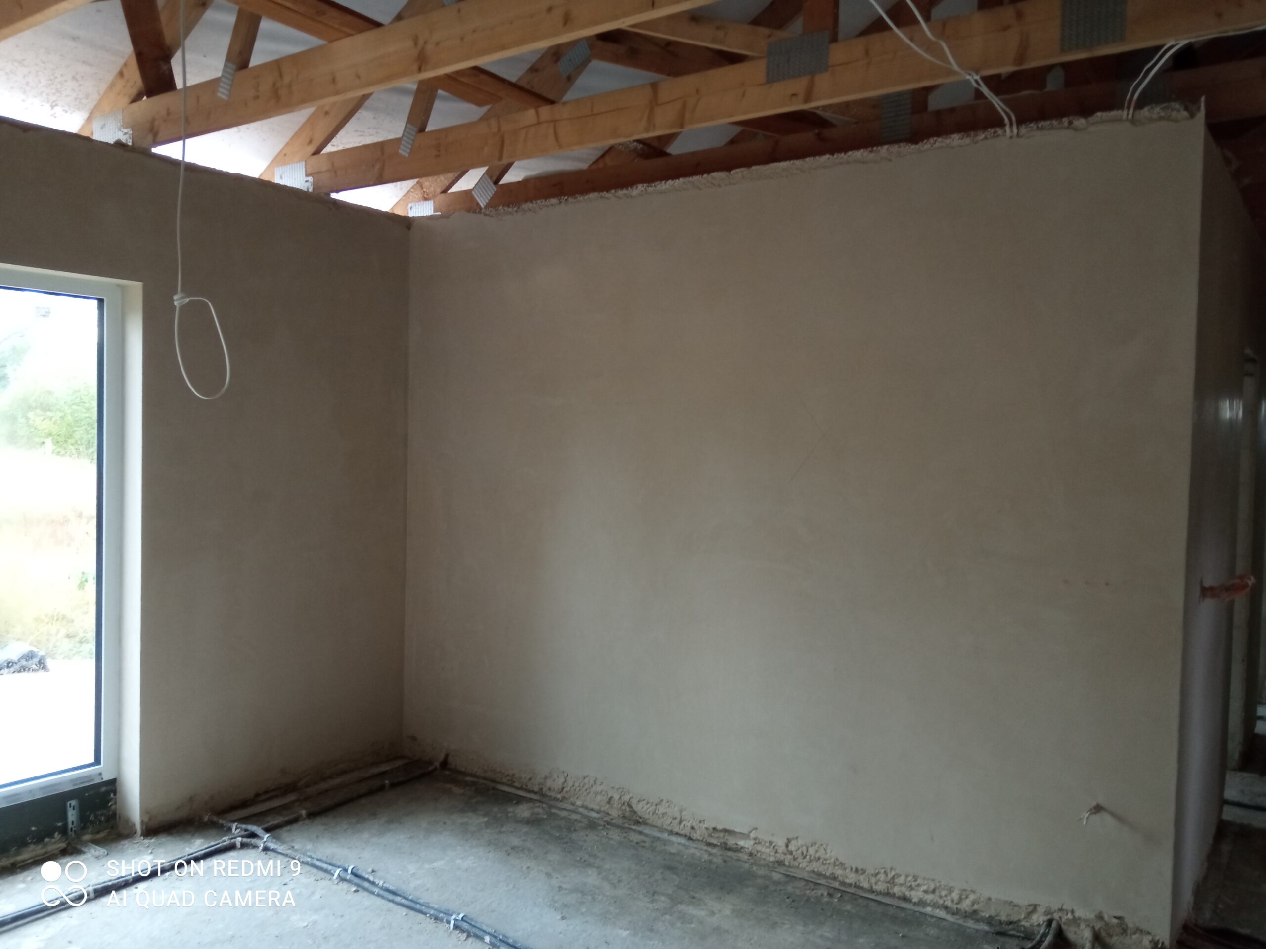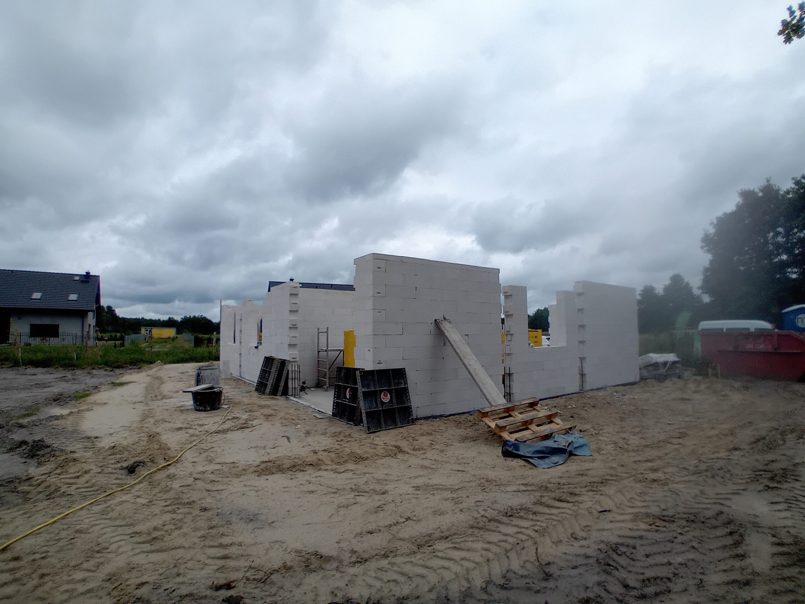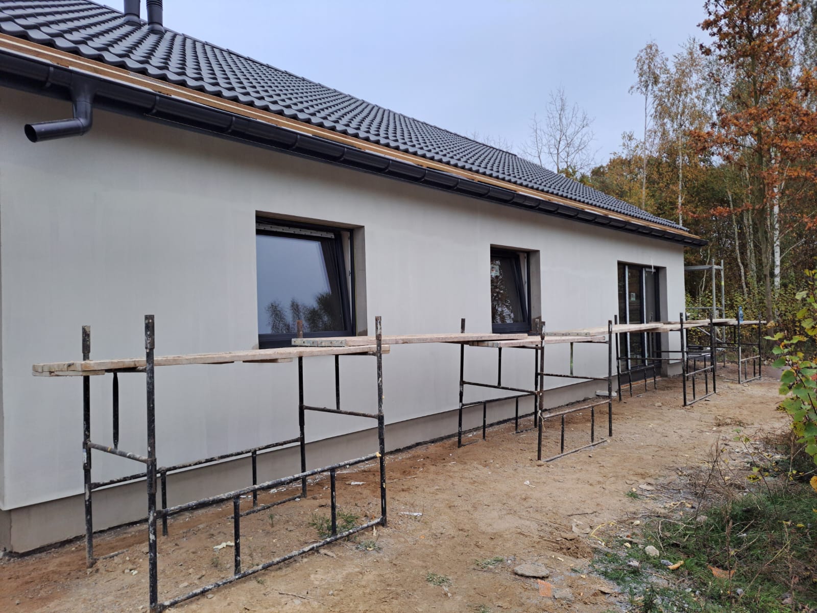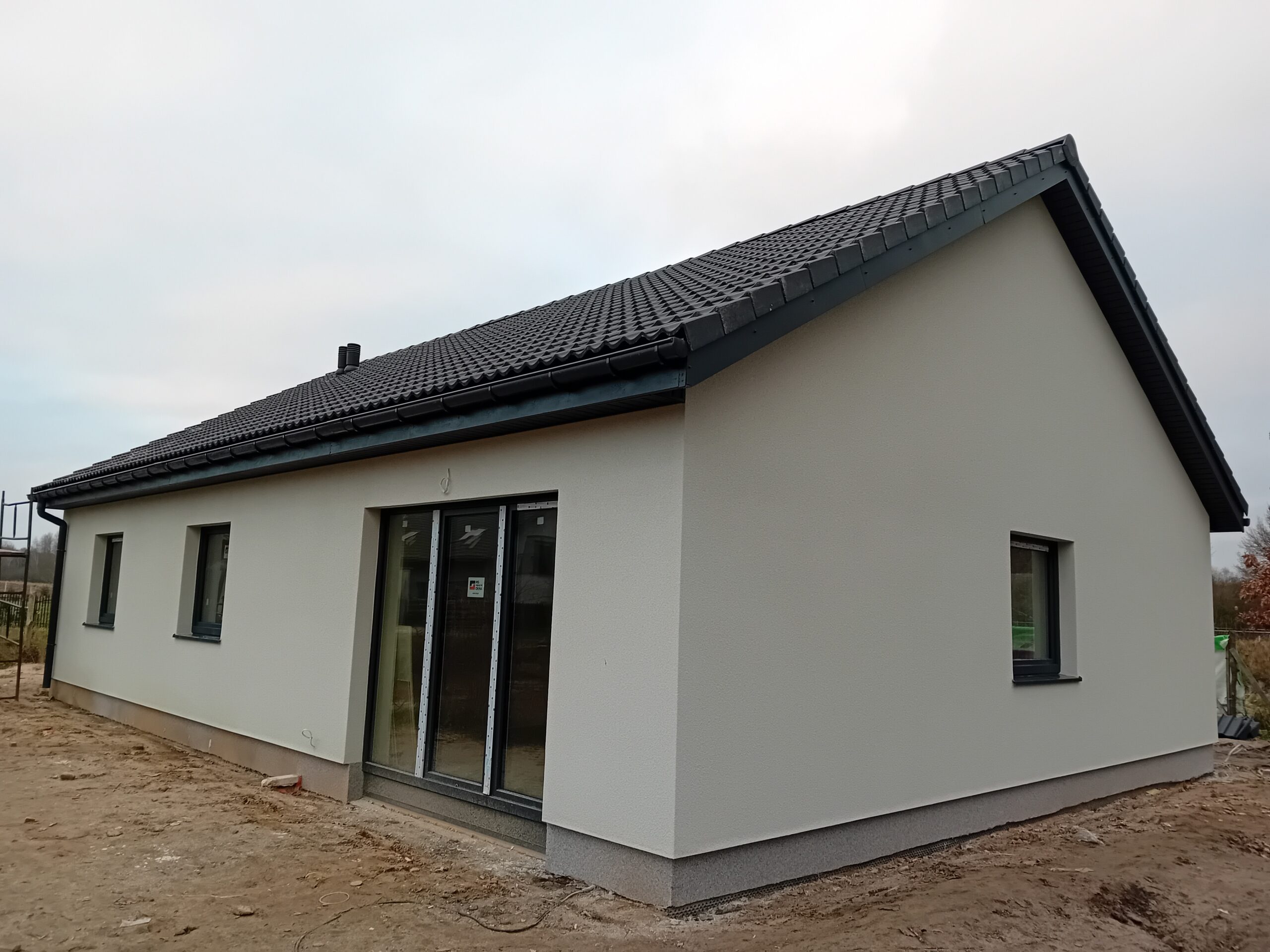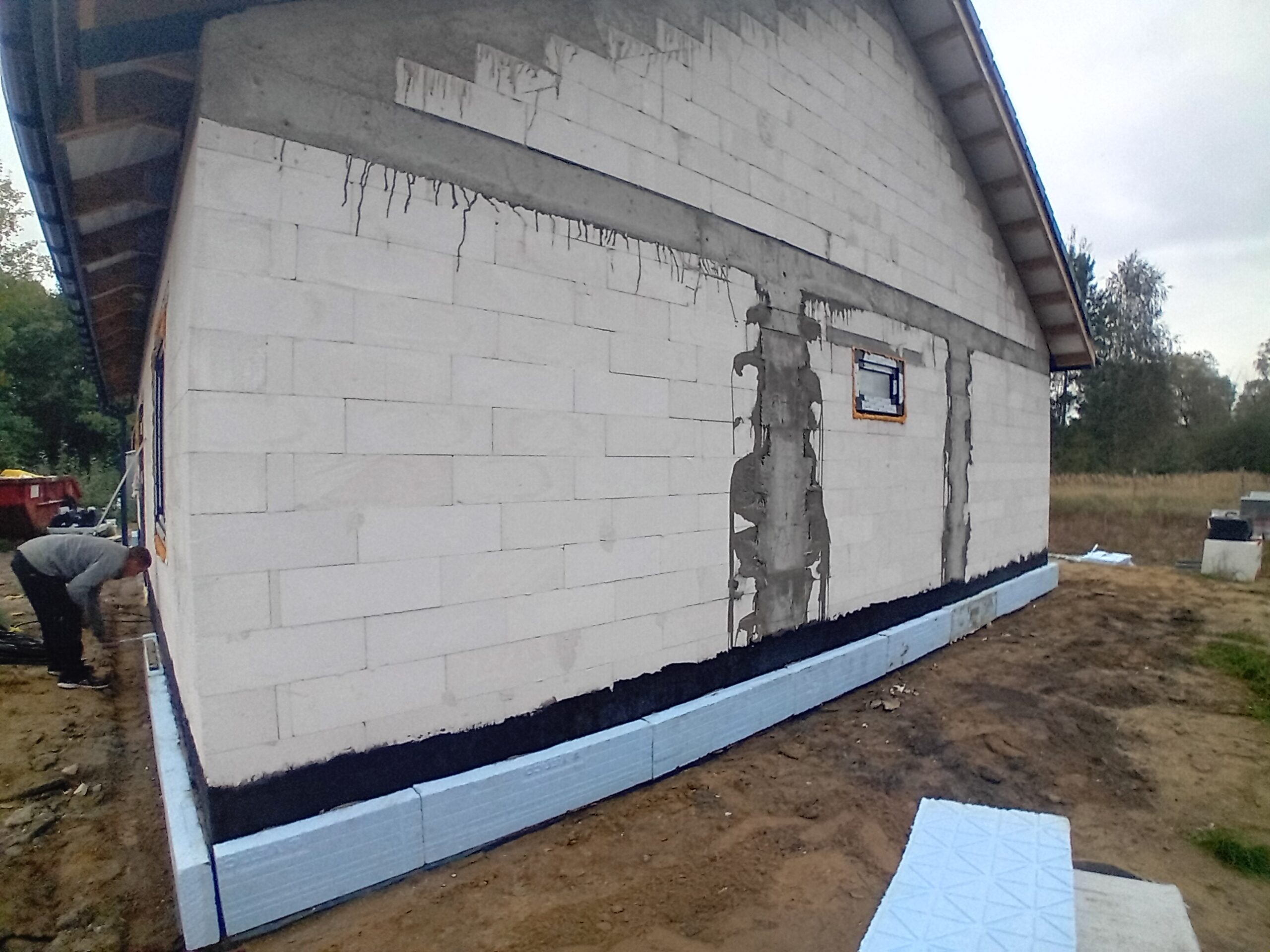 Dach ocieplono pianą PUR o grubości 25 cm, a do ocieplenie ścian zewnętrznych zastosowano styropian grafitowy o grubości 15 cm. Do wykończenia elewacji budynku użyto tynku silikonowego.