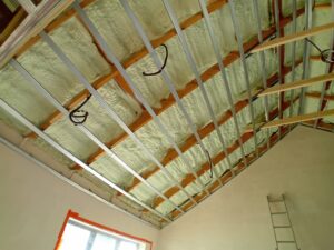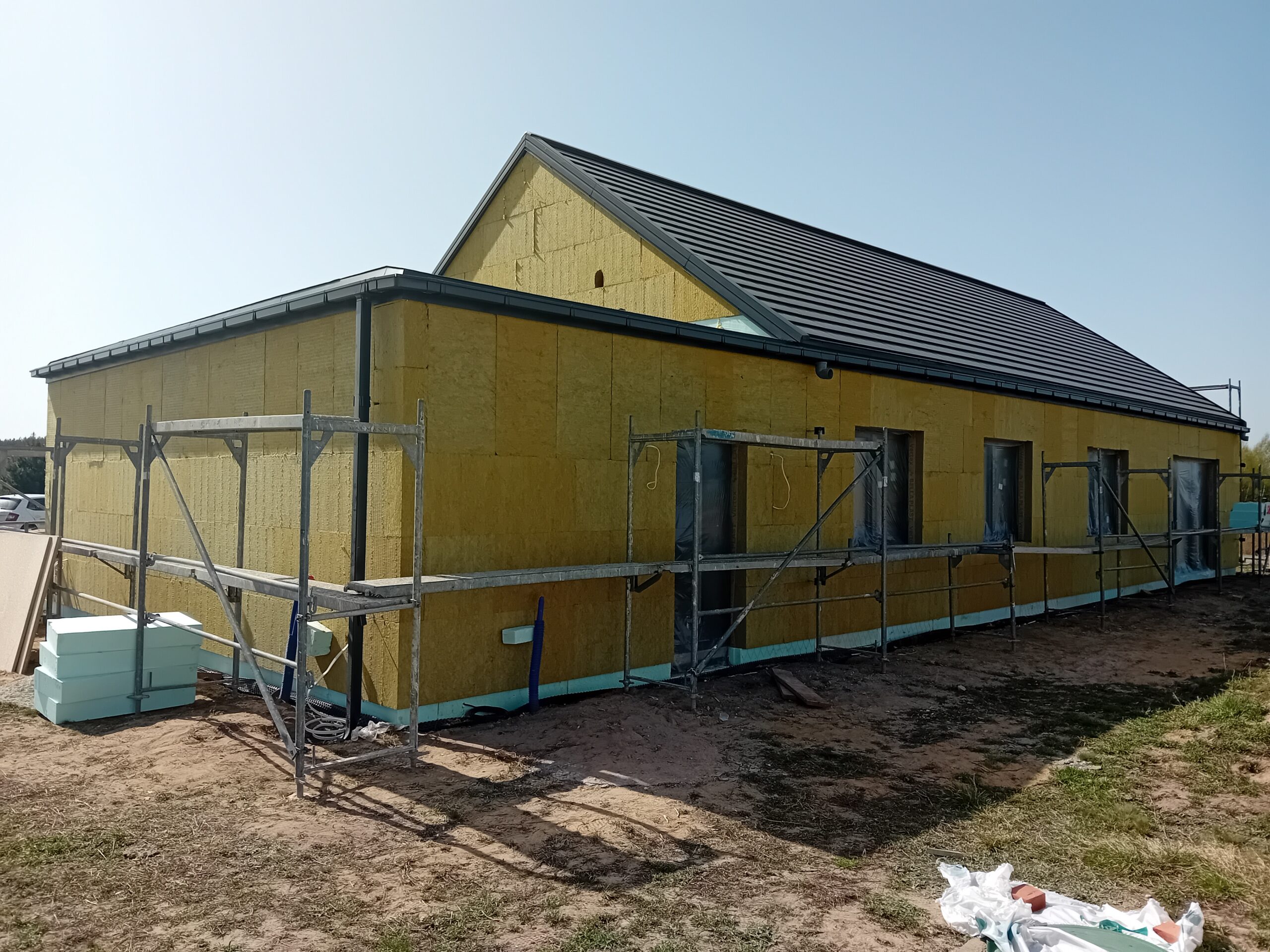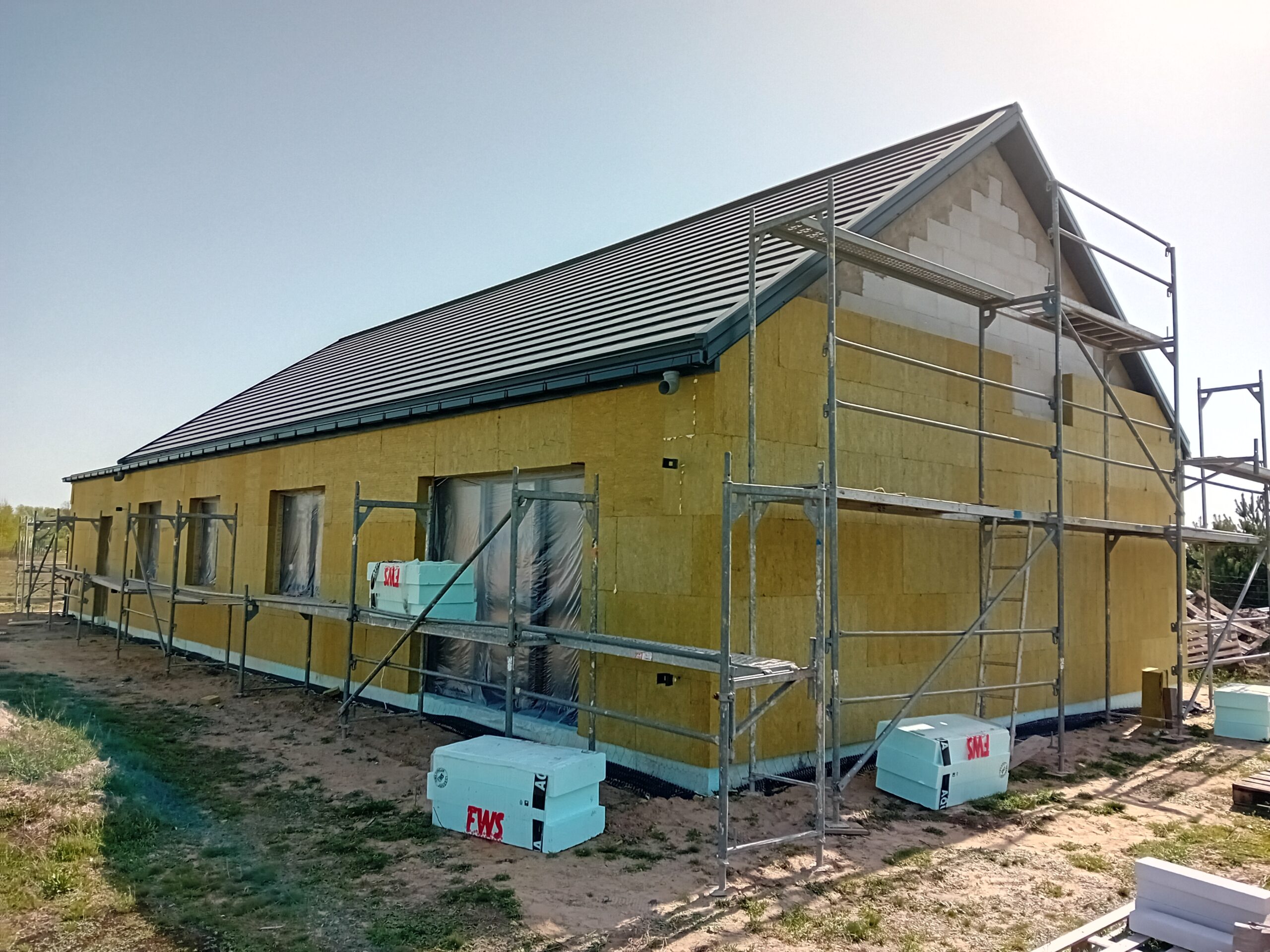 Ocieplenie dachu budynku wykonano pianą PUR o grubości 25 cm, a ścian zewnętrznych – styropianem fasadowym o grubości 20 cm. Do wykończenia elewacji budynku użyto tynku silikonowego.