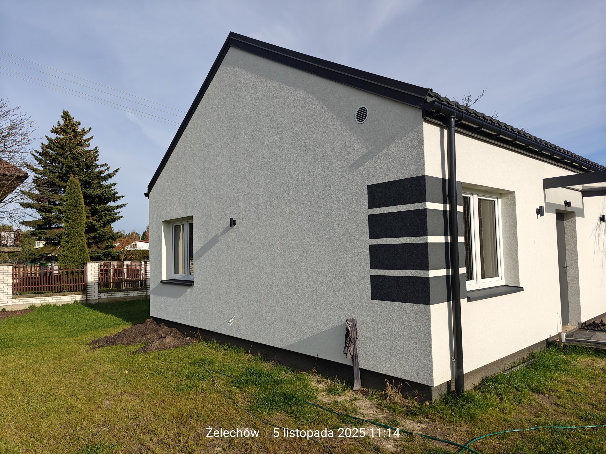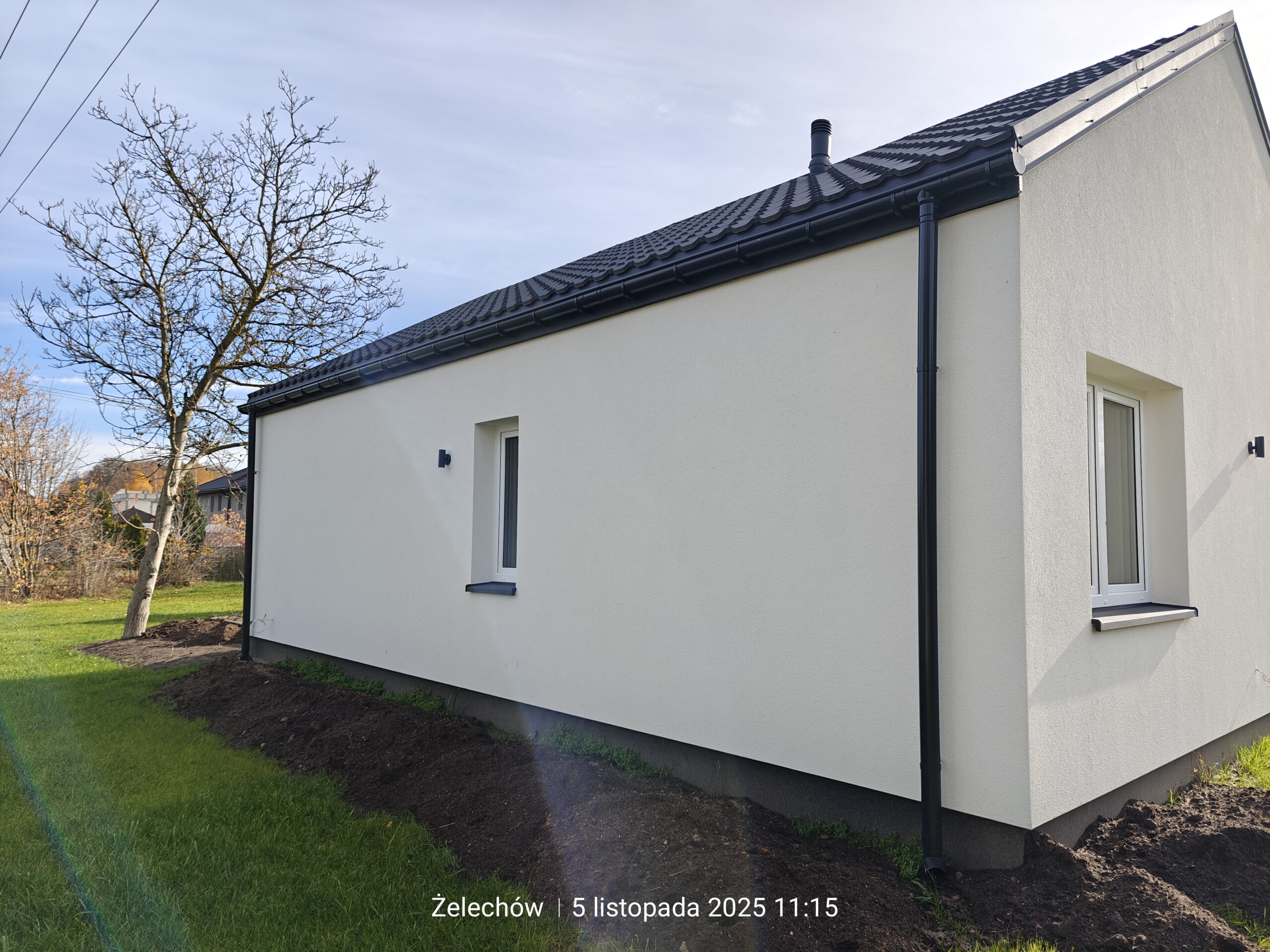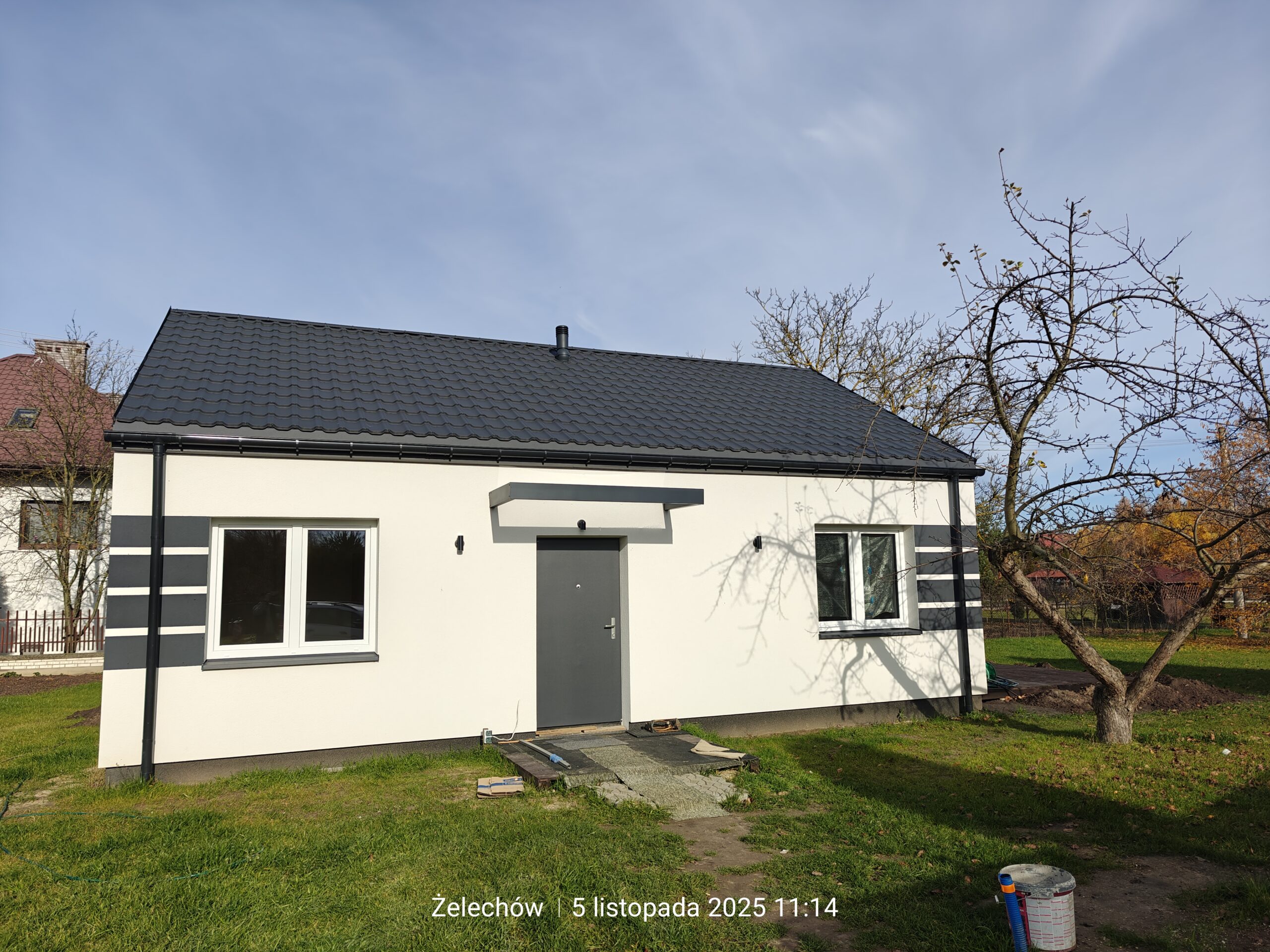 Żelechów – miasto we wschodniej Polsce, w województwie mazowieckim, w powiecie garwolińskim. Tu właśnie usytuowany został dom o powierzchni użytkowej 60 m2 wzniesiony na fundamentach tradycyjnych, czyli zbrojonych ławach i murach fundamentowych. Ściany nośne oraz działowe wykonane zostały z betonu komórkowego o grubości odpowiednio 24 cm i 12 cm. Więźba dachowa została wykonana z elementów prefabrykowanych, a dach budynku pokryto dachówką betonową falistą w kolorze grafitowym.